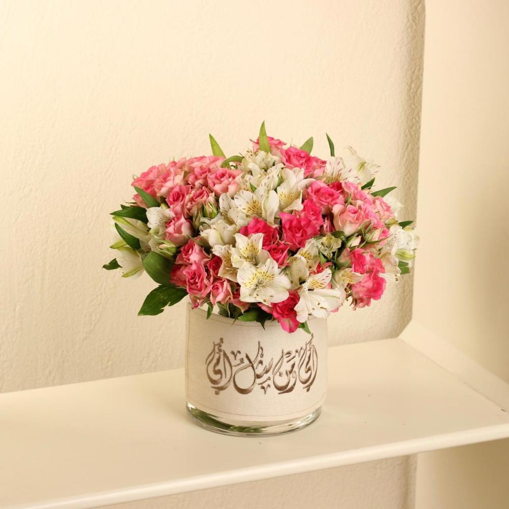 فازة دائرية عبارة عن مزيج مذهل من الاستروميريا الابيضو البيبي جوري البينك مع التطريز المميز بجملة أمي ومن مثل امي