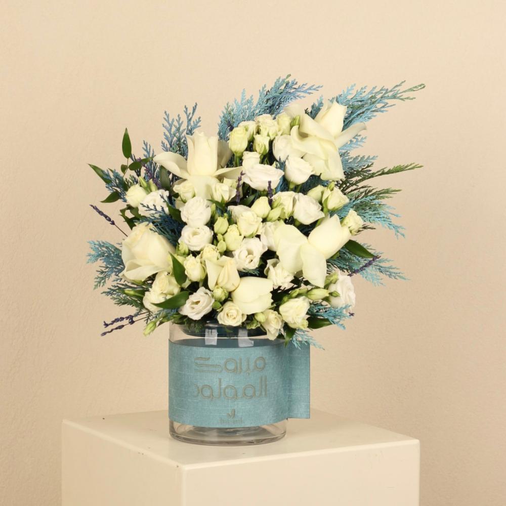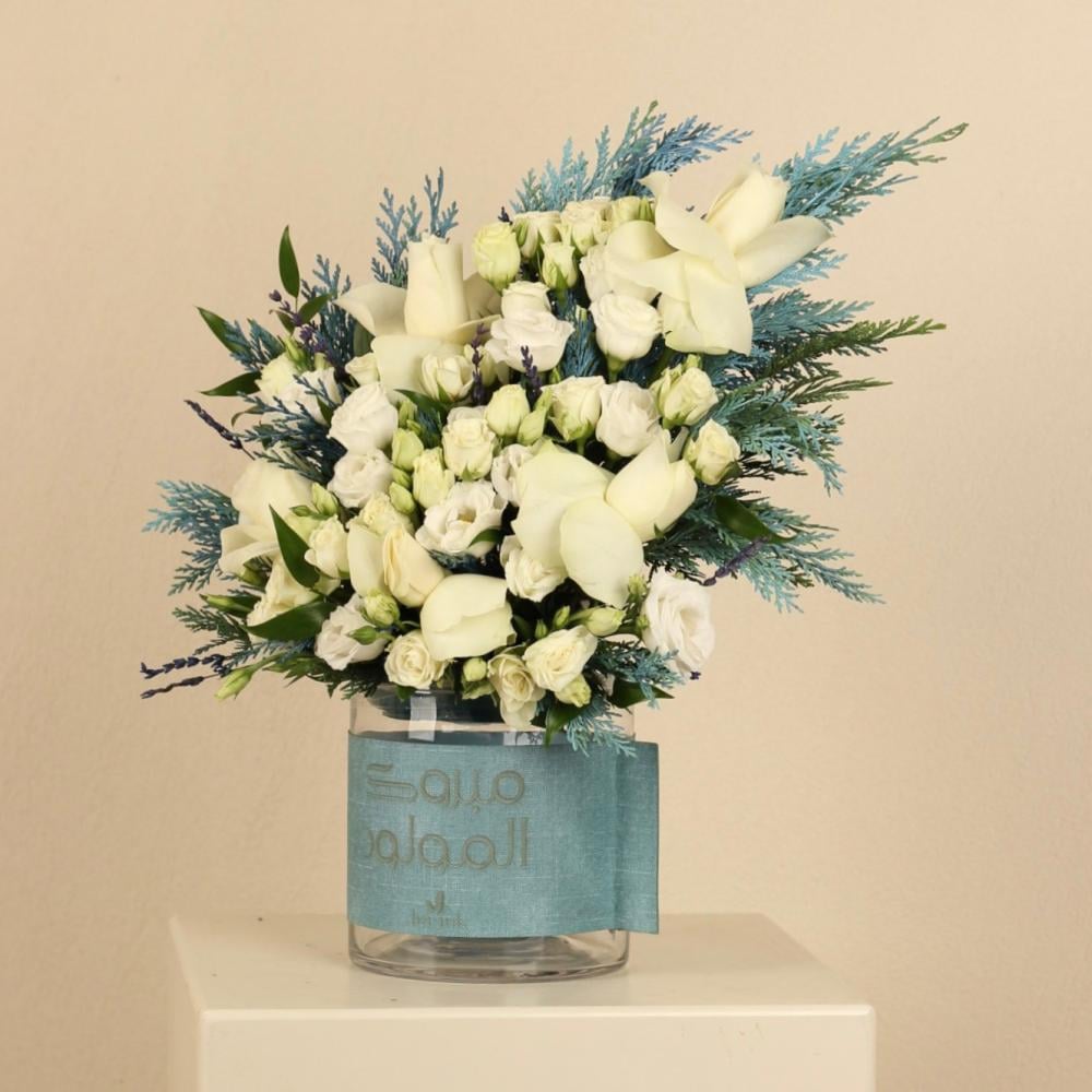 فازه شفاف انيقة بجلد في عباره مبروك المولود منسقة بالورد الطبيعي الجوري الابيض و البيبي الابيض والاكسسوارات الرائعة