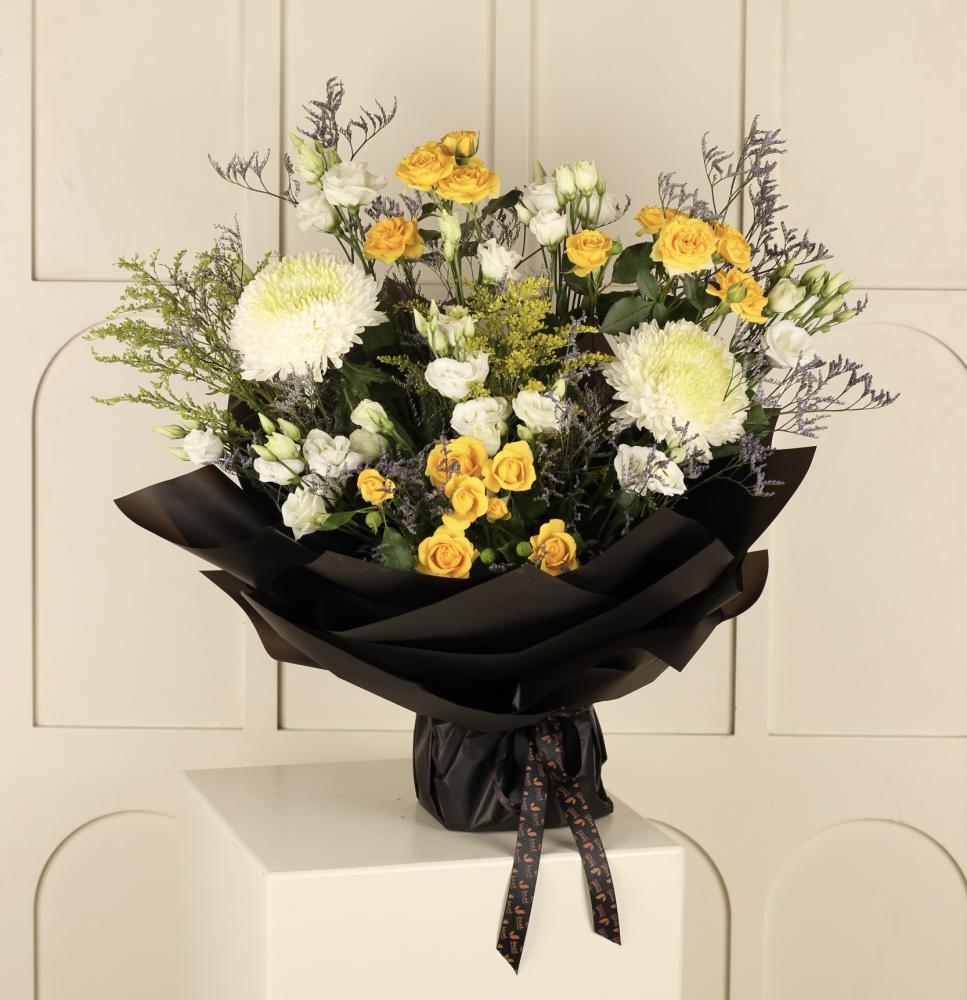 مع اكسسوارات الورد الطبيعي التي تم اضافتها مع تغليف اسود يعطي علي الباقة الجاذبيه