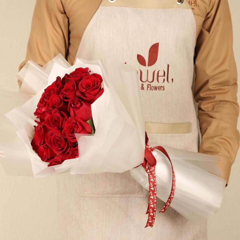 باقة يد مكونه من الجوري الأحمر والتغليف الثلجي الأنيق